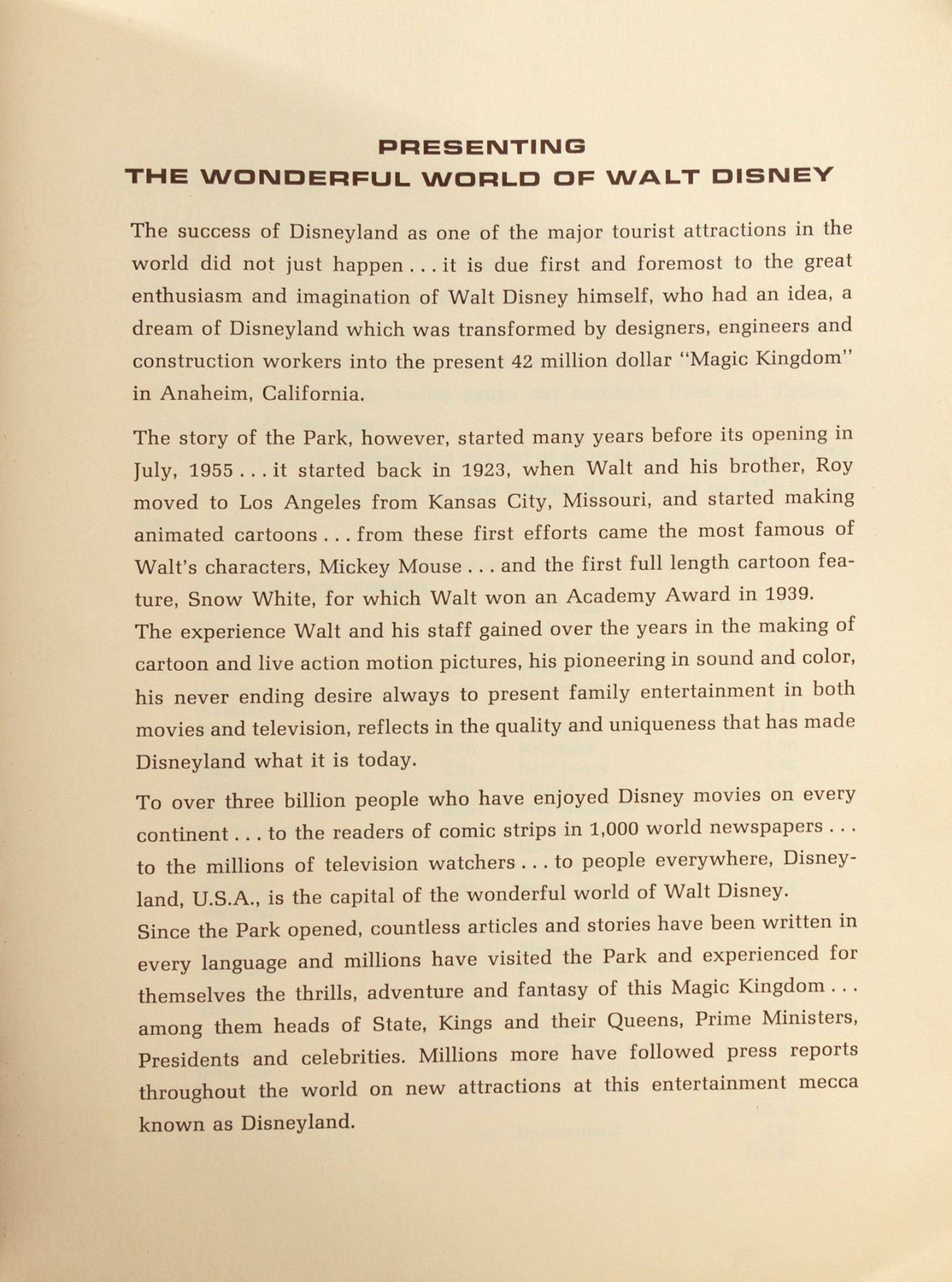 (Disneyland, 1964) A booklet with statistics and facts regarding the park's lessee program. The 6-page bound booklet comes from the collection of Disney Legend Milt Albright, and measures 11.25"x8.75". The condition is fair, with some edge wear from use and spots of discoloration to the front and back cover.