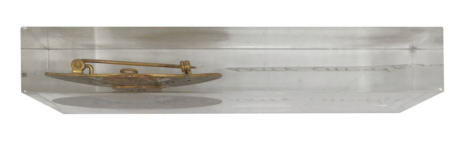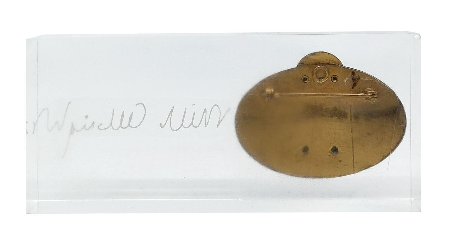 (Disneyland, 1955) An original Disneyland cast member ID badge created for Milt Albright, one of the earliest park employees. The earliest metal badges assigned each cast member a number. Walt Disney himself was number 1, and each subsequent employee was numbered sequentially higher. Officially designated as employee number 10, Albright was one of the park's first employees, initially hired as the manager of accounting. Albright moved on to manage the short-lived Holidayland as well as Group Sales, where he started the groundbreaking Magic Kingdom Club program. This rare metal badge is the lowest number of the original ID badges that we've ever seen offered for public sale. Albright's badge was mounted in lucite along with his signature as a retirement gift. Measuring 2.5"x5.75" and 1" deep within the lucite, this incredible artifact of Disneyland history is in good condition with some scuffing and scratching to the surface of the lucite, particularly on the reverse, and some tarnishing to the metal badge from use and age. Included with the badge is a letter of provenance written and signed by Albright's son.