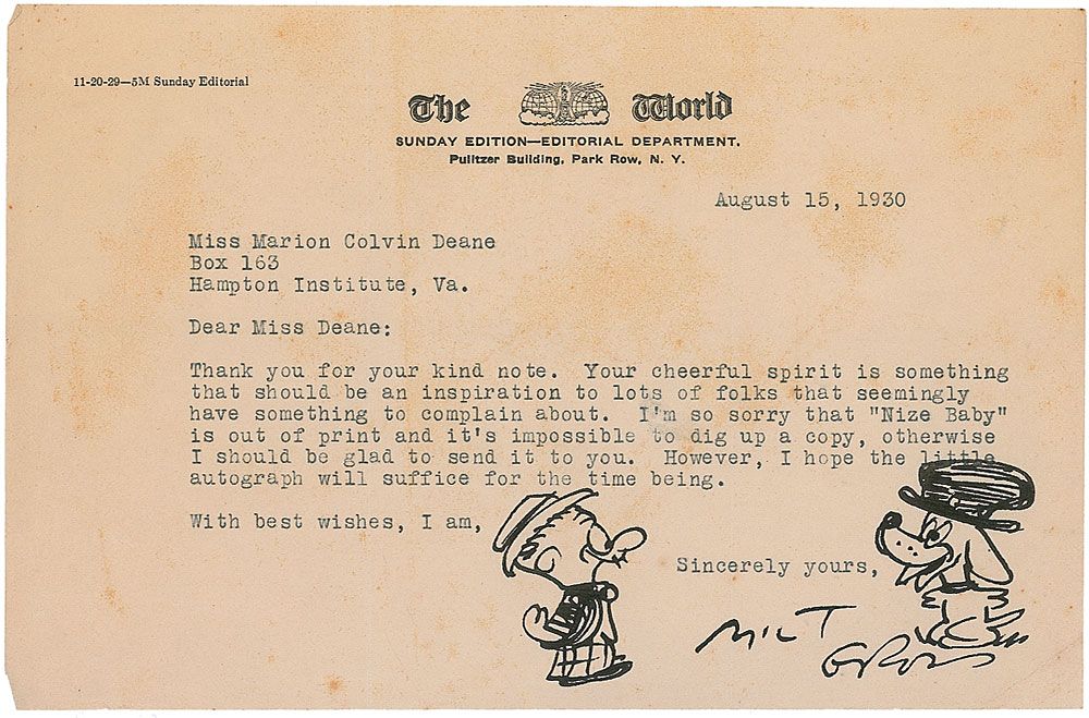 TLS, one page, 8.25 x 5.5, The World letterhead, August 15, 1930. Nice letter to a young collector. In part: “Your cheerful spirit is something that should be an inspiration to lots of folks that seemingly have something to complain about. I’m sorry that ‘Nize Baby’ is out of print…I hope the little autograph will suffice for the time being.” Above his signature Gross adds two ink sketches of two of his comic characters. A vertical fold through a single letter of signature and scattered light toning, otherwise fine condition.