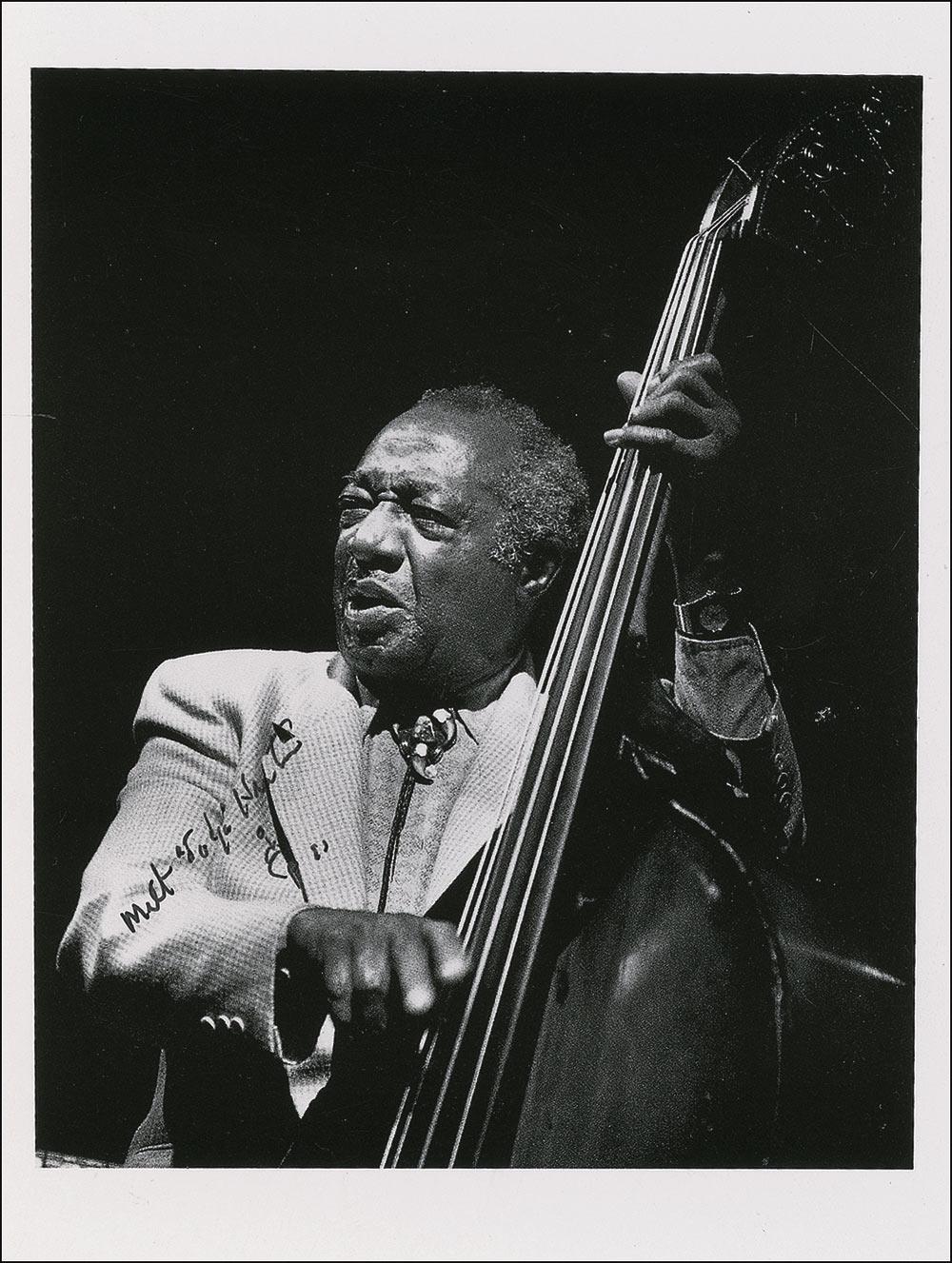 American Jazz bassist (1910-2000), referred to as ‘the dean of jazz bass players.’ Cardstock 5 x 6.5 photo of Hinton playing a bass, signed in black felt tip. In fine condition.