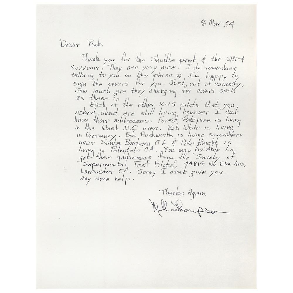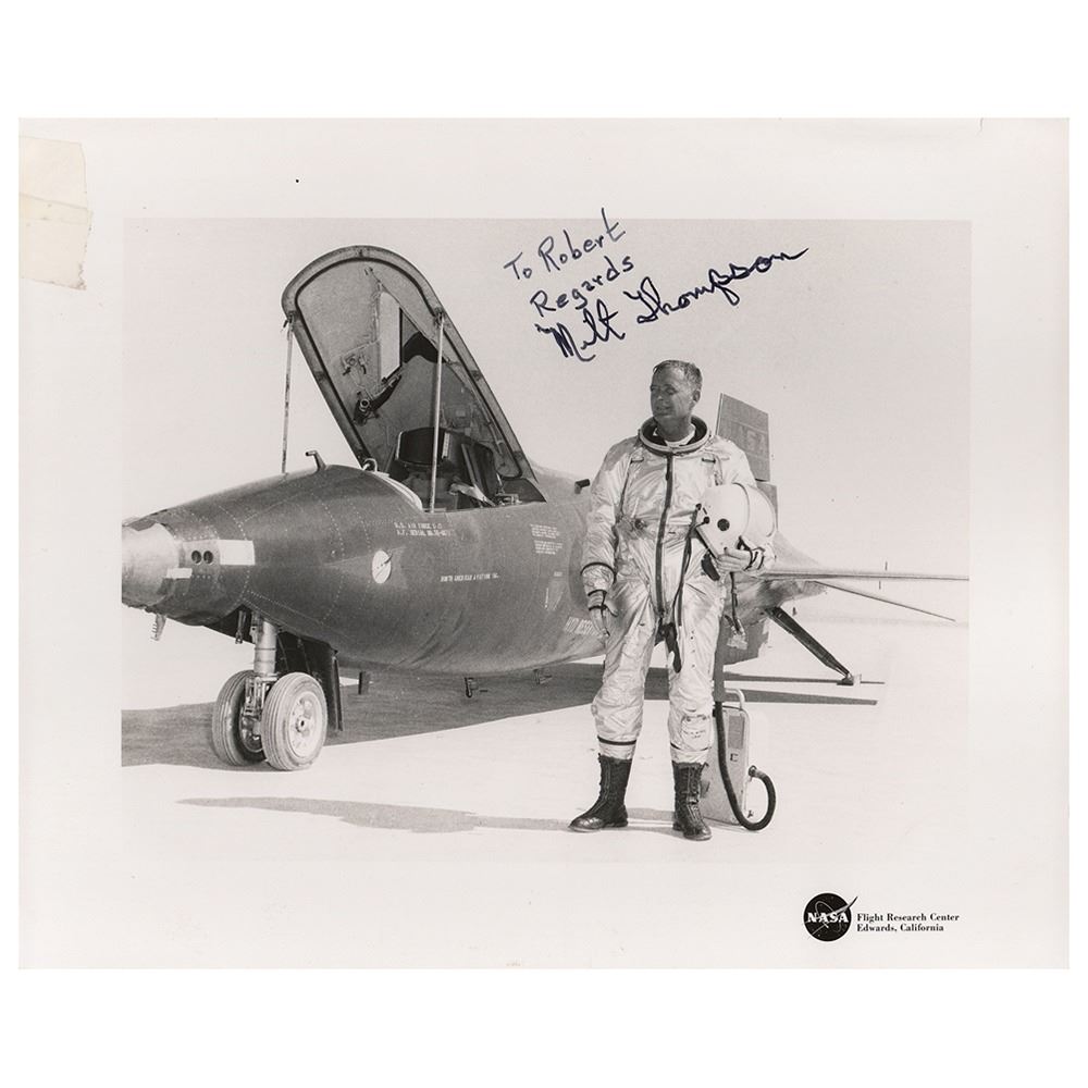Two items: an ALS, one page, 8.5 x 11, handwritten letter to Bob Jaques, in part: “Each of the other X-15 pilots that you asked about are still living however I don’t have their addresses. Forrest Petersen is living in the Wash D.C. area. Bob White is living in Germany. Bob Rushworth is living somewhere near Santa Barbara CA & Pete Knight is living in Palmdale CAâ€; and an official glossy 10 x 8 NASA photo of Thompson in his pilot's gear beside an X-15, signed and inscribed in black felt tip, "To Robert, Regards, Milt Thompson.†In overall very good to fine condition, with creases, surface impressions, and clear tape to the border of the signed photo.