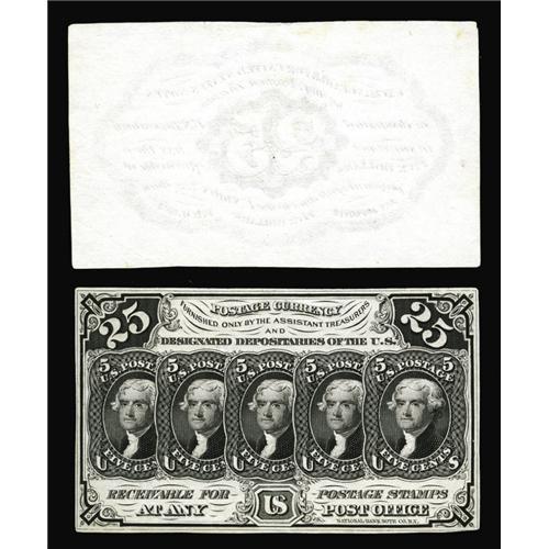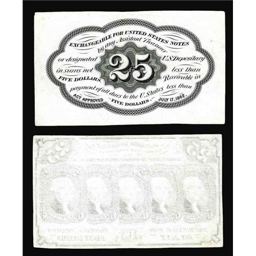 <B>Milton 1DP25F.1 and 1DP25R.1 25¢ First Issue Trial-Color Die Proof Pair Choice New.</B></I> This lovely and irreplaceable unique pair first came to light in the October 20, 1904 sale of the Pick Collection held by S.H.& H. Chapman. Both the face and back have narrow margins and are printed in black ink on soft white paper. Both are deeply impressed through the paper, leaving a heavy embossing effect plainly visible on the back of each uniface piece. These were apparently pulled from finished plates, as all the design elements are identical to the issued notes. Each has an incredible sharpness of impression that simply does not exist on regular-issue notes or normal Specimen printings. Only when truly landmark collections reach the market are exquisite rarities like this pair available to a new generation of collectors.