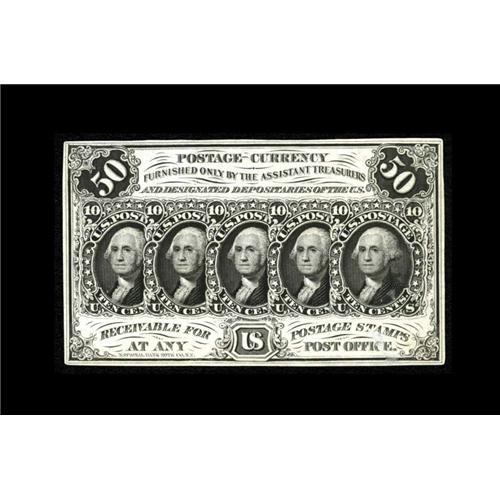 <B>Milton 1DP50F.1 50¢ First Issue Trial-Color Die Proof About New.</B></I> Printed on soft, white India paper in black ink, this off-color trial printing is clearly from a brand new plate, as every line of the engraving is razor sharp. There are a few light handling marks and a very tiny paper pull at the lower right, at the "C" in "OFFICE," but the overall appearance far outweighs these minor faults. This magnificent rarity is unique. Not even a rumor of another exists. Although this is a Narrow Margin Proof, the margins are free of the frame line all around the note. This Proof realized $1650 in our January 1997 auction of the Milton Friedberg Collection. Prior to that, it was lot 568 from the Chapman's October 20, 1904 auction.<BR><BR><b>Shipping:</b> Coins & Currency (<a target="_blank" href="http://www.heritageauctions.com/common/shipping.php">view shipping information</a>)