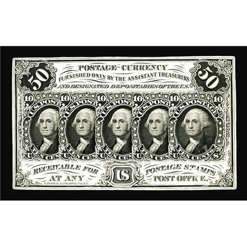 <B>Milton 1DP50F.1 50¢ First Issue Trial-Color Die Proof About New.</B></I> Printed on soft, white India paper in black ink, this off-color trial printing is clearly from a brand-new plate, as every line of the engraving is razor sharp. There are a few light handling marks and a very tiny paper pull at the lower right, but the overall appearance far outweighs these minor faults. This magnificent rarity is unique. Not even a rumor of another exists. Although this is a Narrow Margin Proof, the margins are free of the frame line all around the note. This Proof realized $1,650 in our January 1997 Sale. Prior to that, it was lot 568 from the Chapman's October 20, 1904 Sale.