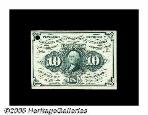 <B>Milton 1E10F.2 10¢ First Issue Cardboard Proof Gem New.</B></I> Printed on cardboard that is extremely similar to Bristol board. The note has an inexplicable, perfectly round hole punched out of the upper-left-hand corner. It's from the finished plates, with an incredible sharp Proof quality as well as perfect color. Previously lot 877 of our January 1997 Friedberg Collection, it realized $770 at that time, which certainly seems like a bargain now.