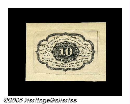 <B>Milton 1E10R.1a 10¢ First Issue Essay New.</B></I> Printed in black ink on a thin brownish paper which is in turn mounted to light card. The card is identical to that on which the printed-on-cardboard face in the previous lot is mounted. This and the note above are the 10¢ pair that are identical to the 5¢ pair that appear as lots XXXXXXXXX and XXXXXXXXX.