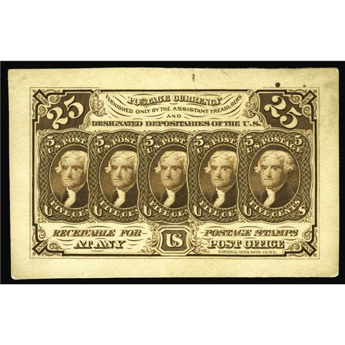 <B>Milton 1E25F.1c 25¢ First Issue Essay Choice About New.</B></I> This 25¢ face is printed from the finished plate much like the previous 10¢ example and printed on card stock (Bristol Board?) This piece is unique to our knowledge and missing from our massive Friedberg Sale. This is one of a very few First Issue notes we know of that are actually printed (as opposed to being mounted) on card. There is a very light vertical fold present.