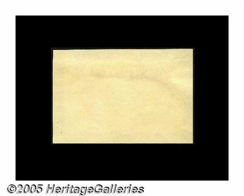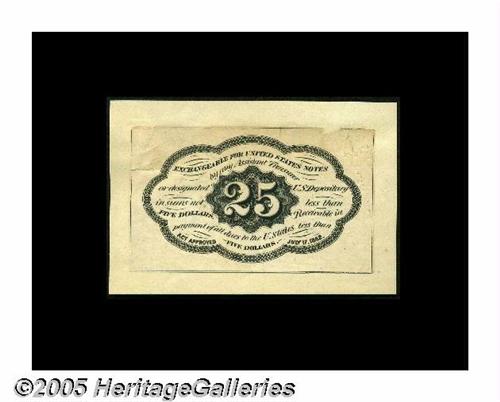 <B>Milton 1E25R.1a 25¢ First Issue Essay About New, Damaged.</B></I> Printed in black ink on a thin brownish paper which is in turn mounted to light card. The card is identical to that on which the printed-on-cardboard face in the previous lot is mounted. This and the note above are the 25¢ pair that are identical to the 5¢ and 10¢ pairs that appear earlier. This piece has a few tears, some minor edge damage and a few small holes, but all of those defects are clear of the design itself.