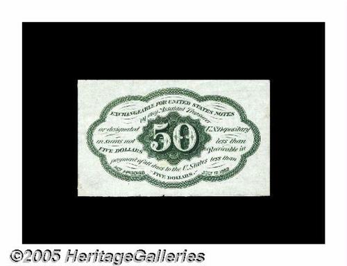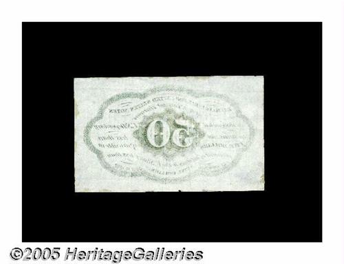 <B>Milton 1E50R.1 50¢ First Issue Trial Color Essay Choice New.</B></I> Printed in bright green ink on thin white India paper, this off-color First Issue back is unique. No other example is known of or suspected to exist. The note is pristine and beautifully bright, its only problems being some very minor glue traces at the edges of the blank back and two miniscule nicks at the margins. All First Issue Essays are of the highest rarity, and this one has the added attraction of great eye appeal due to the striking back color that does not exist on any other First Issue note. <I>ex-lot 195 in Lester Merkin's September 11, 1974 sale; lot 884 CAA MRF 1/97.</B></I>