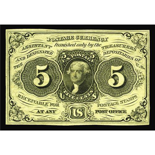 <B>Milton 1E5F.2 5¢ First Issue Essay Superb Gem New.</B></I> Printed in black on a soft yellow paper. The underlying yellow color gives the black ink a deep slate grey appearance. This note is from the finished plate, differing from a regular-issue face printing only in its color, paper and double frame line. The condition is absolutely flawless, without the slightest hint of a defect, and the deep, original embossing is plainly evident on the blank back. It is very rarely that any Fractional Currency Essay can be called Gem. The note we offer here is unquestioned in its extreme rarity and flawless in its condition. ex-Chapman October 20, 1904 and CAA 1/97.