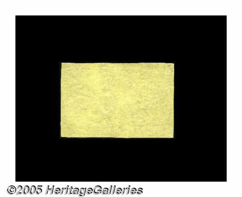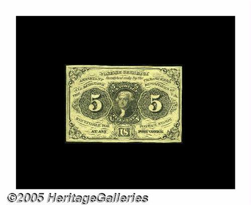 <B>Milton 1E5F.2 5¢ First Issue Essay Superb Gem New.</B></I> Printed in black on a soft yellow paper. The underlying yellow color gives the black ink a deep slate grey appearance. This note is from the finished plate, differing from a regular-issue face printing only in its color, paper and double frame line. The condition is absolutely flawless, without the slightest hint of a defect, and the deep, original embossing is plainly evident on the blank back. It is very rarely that any Fractional Currency Essay can be called Gem. The note we offer here is unquestioned in its extreme rarity and flawless in its condition.<I>ex-Chapman October 20, 1904 and CAA 1/97.</B></I>