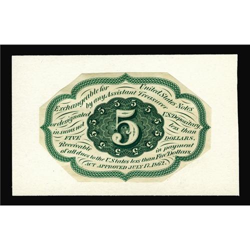 <B>Milton 1E5R.3 5¢ First Issue Proof Printed in Green Gem New.</B></I> This piece is unlisted in the Encyclopedia, as its existence was not even suspected until it surfaced in the late 1980's. This note, which is unique to our best knowledge, is printed in green on thin India paper, which is mounted to pure white board. The India paper is trimmed around the design in an octagonal shape. Off-color First Issue Proofs are extreme rarities, with only a few known for all denominations combined. The beauty of this bright green piece is additionally enhanced by its razor-sharp printing quality.