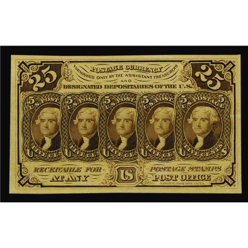<B>Milton 1P25F.1a 25¢ First Issue Proof Gem New.</B></I> A letter-perfect, razor-sharp proof printing of the 25¢ First Issue face. Both the note and its backing appear to have been cut from a presentation book. Previously part of the Tom O'Mara and prior to that the Doug Hales Collection.