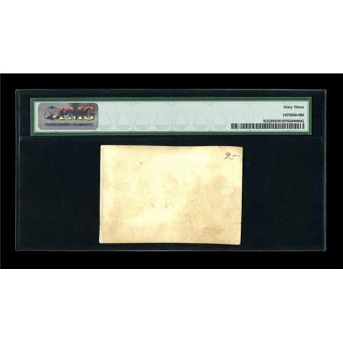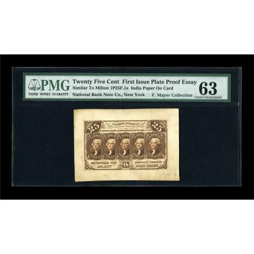<B>Milton 1P25F.1e 25¢ First Issue Proof PMG Choice Uncirculated 63.</B></I> Lot 230 from Stack's June 13, 2005 sale. It was described there as, "Punch canceled," which it is not. It's a Plate Proof from the finished plate, identical to the Regular Issue note in almost every respect, including the single frame line. The only difference is in the frame line itself, which is not complete across the top of the note. It's printed on India paper, which is mounted to soft, thick card. The paper was mounted prior to the printing, as the embossing of the plate pressure goes through to the back of the card. Like all First Issue Proofs, this is an extreme rarity. Mr. Mayer paid a hair over $2500 for this piece over two years ago.<BR><I>From The Frederick Mayer Collection</B></I><BR><BR><b>Shipping:</b> Coins & Currency (<a target="_blank" href="http://www.heritageauctions.com/common/shipping.php">view shipping information</a>)