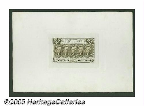 <B>Milton 1P25F.1e 25¢ First Issue Proof.</B></I> A gorgeous Wide Margin 25¢ Proof printed in the normal brown ink but on pure white paper. It's from the completed plate, but a far sharper impression than that seen on regular-issue notes. The paper has an extremely light "945" printed at the top of the wide margin. There are four small round punch holes at the bottom of the design. The Proof is mounted to a large board, and the mounting was accomplished prior to the printing, as the impression of the plate and the embossing of the printing can be clearly seen through to the back of the card. Included is a second card, which from the embossing alone shows us that the 50¢ First Issue Proof had once been attached. The note is now missing, but the embossing remains clear. Both items trace their history to the Memphis 1983 HIM auction.