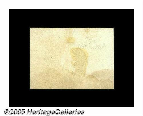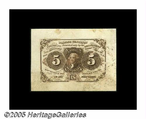 <B>Milton 1P5F.1F 5¢ First Issue Proof New.</B></I> Printed from the completed plate (double frame line removed) in brown ink on thin, soft proofing paper. That paper is in turn mounted on a soft card. In the Fractional Encyclopedia, where this note is plated both sides on page 22, Milt referred to the backing as being "almost blotter paper." Pencil notations on the glue-stained back read, "74a not in Val," which refers to the 1924 Valentine reference book. There is a considerable amount of surface damage on the front, but the design is seriously affected only at the lower right corner. Estimated at $400 in our 1997 Sale, it realized $687.50.