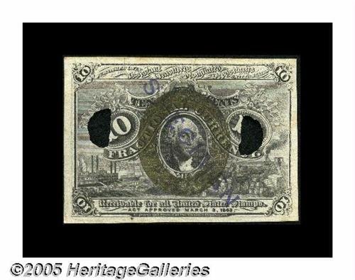 <B>Milton 2E10F.4 10¢ Second Issue Experimental Gem New.</B></I> Tom O'Mara acquired this as lot 73 of our January 1996 Sale. It's the type of Valentine 214. A scarcer Experimental denomination. Superb but for a touch of stray ink on the blank back.