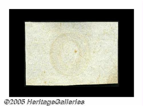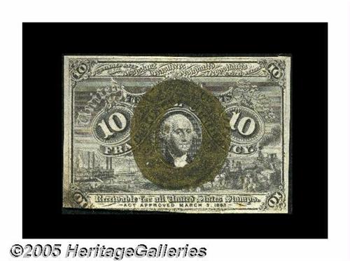 <B>Milton 2E10F.4d 10¢ Second Issue Experimental Choice New.</B></I> An interesting and rare piece that is not stamped or punched and has two distinct bronze ovals around Washington's portrait. This is not simply a heavily printed oval. It's two ovals that have been placed on the note at separate times. One is the normal bronzing, and the other the heavier experimental bronzing that embossed its way through to the blank back. Previously lot 940 of our MRF sale, but acquired by Tom at a later date.