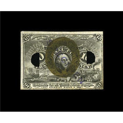 <B>Milton 2E10F.4e 10¢ Second Issue Experimental New.</B></I> This scarce Experimental is rubber stamped "SPECIMEN," has two half moon cancels, plus it has a blank back. It also appears to have a double bronze oval surcharge.<BR><BR><b>Shipping:</b> Coin/Currency (<a target="_blank" href="http://www.heritageauctions.com/common/shipping.php">view shipping information</a>)