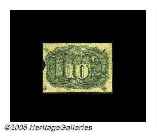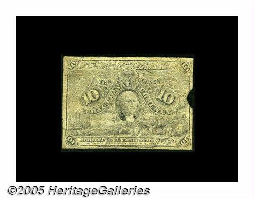 <B>Milton 2E10FR.1 Second Issue 10¢ Negative Essay Fine.</B></I> This is the only truly circulated example of any Fractional note we have ever seen with the Negative Essay printing on the back. This piece gives the appearance of a regular issue note, lacking only the bronze oval on the face - but on closer examination, it becomes apparent that the note is not a regular issue note at all, but rather a Negative Essay Back with the "D-5-18-63" corner surcharges. Somehow, this Experimental note slipped into the channels of commerce, where it clearly circulated freely for quite some time. It became rather well worn, lost a small piece from its right edge and acquired a few minor edge tears. Negative Essay notes were never intentionally issued for circulation. The obvious circulation on this piece, and the illusion it creates of this being a regular issue note, adds a great "what might have been" mystique to this Reverse Matrix Experimental.