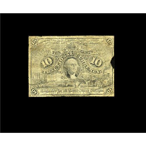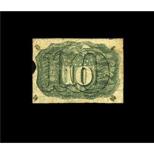 <B>Milton 2E10FR.1 Second Issue 10¢ Negative Essay Fine.</B></I> This is the only truly circulated example of any Fractional note we have ever seen with the Negative Essay printing on the back. This piece gives the appearance of a regular issue note, lacking only the bronze oval on the face - but on closer examination, it becomes apparent that the note is not a regular issue note at all, but rather a Negative Essay Back with the "D-5-18-63" corner surcharges. Somehow, this Experimental note slipped into the channels of commerce, where it clearly circulated freely for quite some time. It became rather well worn, lost a small piece from its right edge and acquired a few minor edge tears. Negative Essay notes were never intentionally issued for circulation. The obvious circulation on this piece, and the illusion it creates of this being a regular issue note, adds a great "what might have been" mystique to this Reverse Matrix Experimental.