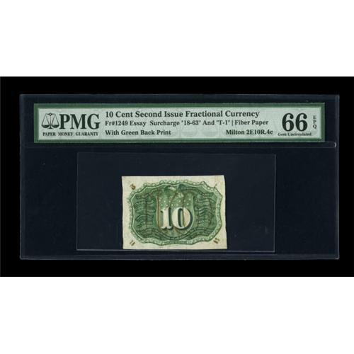 <B>Milton 2E10R.4c 10¢ Second Issue Experimental PMG Gem Uncirculated 66 EPQ.</B></I> This is an absolutely gorgeous example of this unpunched, unstenciled Experimental note. But for the lack of the face engraving, it is identical to Fr. 1249, the Regular Issue Fiber Paper 10¢ note. About a half dozen of this variety are known. This one, which has received the extremely high 66 EPQ grade from PMG, is very likely the finest of them.<BR><BR><b>Shipping:</b> Coins & Currency (<a target="_blank" href="http://www.heritageauctions.com/common/shipping.php">view shipping information</a>)