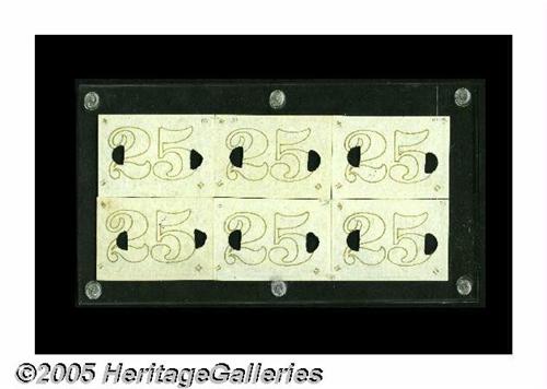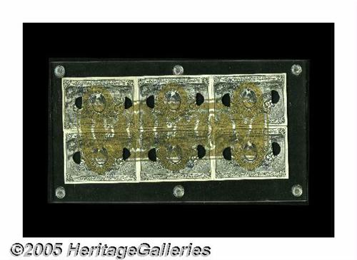 <B>Milton 2E25F.2 25¢ Second Issue Essay (Experimental) Matching Block of Six.</B></I> This incredible block was painstakingly reassembled by Milt Friedberg after the pieces that appeared in the Fraser Collection Sale in 1982 presented the possibility of this block's eventual completion. The story told above with the Baltimore-Washington pieces is identical for this and the next few lots. However, on this and the following lots, the paper with the bronze overprint was not prepared for National Bank Notes, but rather it was bronzed to be used for United States Treasury Bonds issued in 1862. These bonds were referred to as "Five-Twenties of 1862," as they were to be redeemable after five years and payable after twenty. The Ed Frossard list of October 1, 1893 (see next lot), which offered the Spencer Clark Collection, presented individual 25¢ Experimental notes with this additional bronzing as item number 32 (multiples were available), commenting that they had the "S-18-63" surcharge on the back corners, "But with the addition of heavy large gold characters on the entire front, in some [pieces] nearly solid." These Frossard item #32 pieces were sold to a number of different collectors, and they became scattered. It was never known if the proper pieces existed to reconstruct an entire block. In Superior's 1982 Fraser Sale, five of these notes were offered. It appears as though the original owner of these five pieces had been purchasing notes in an attempt to reconstruct a full block. The five pieces that he obtained <I>could</B></I> be lined up to spell five-sixths of the word, "FIFTY." They were not, however, all from the same sheet, as in order to line up the "FIFTY," the notes had to be juxtaposed such that their margins did not line up. Milt purchased that incomplete set of five. Three of those five notes are in this presently offered block of six: the two at the right and the one in the lower left corner (as the word FIFTY faces the reader). Milt then entered into a complex trade involving several dealers and collectors (as well as two Skeksis and a Wookie) and obtained the three original notes that completed this incredible block, one of which, the upper left corner piece, bears the courtesy autograph of John Burke. Although a few other single pieces exist, it is incredibly unlikely that another block could ever be assembled. Most Fractional collectors felt that this block was the cornerstone of Milt Friedberg's incredible collection of Fractional-developmental pieces. Tom O'Mara acquired this irreplaceable item at the Friedberg Sale, and it is now time for another collector to enjoy the ownership of an item that can never be duplicated. <I>All six notes trace their origin to Ed Frossard's October 1, 1893 special list #8, which offered the Spencer Clark Collection. All were listed as item #32; he didn't consider the six different positions as different varieties, and the total for sale is unknown but likely about fifteen pieces. Some later appeared in Chapman Sales, such as the Friedman Collection Sale of June 3-4, 1903 and the Wilcox Collection Sale on February 15, 1904. Others appeared in later sales throughout the next 75 years. When Superior sold the Fraser Collection on February 1, 1982, five pieces appeared as lot 66. Three of those five pieces are in this block. The other three were obtained in a complicated trade completed by Milt in the mid 1980's.</B></I>