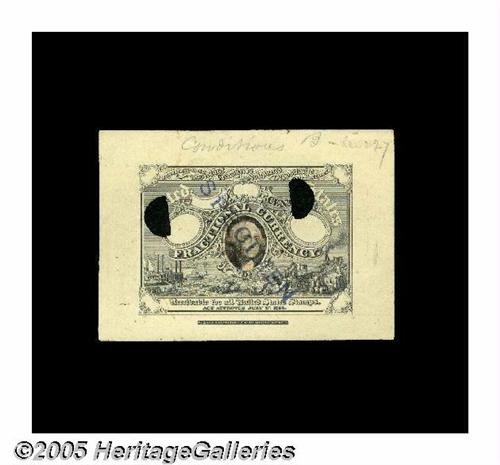 <B>Milton 2E25F.2h Second Issue Progress Proof Choice New.</B></I> When Superior offered this note as lot 44 of the Fraser Collection in 1982, it was listed as 2E5F.2e. However, that number lacks the portrait. This, with the portrait pasted on, is correctly 2E5F.2h. It was item #54 of Ed Frossard's October 1893 listing, asterisked there as being unique to the Clark Collection. As with the lot above, this is one of the earliest progress proofs of the Second Issue, bearing the earlier act date of July 17, 1862 and lacking many elements of the finished plate. This is also part of a very short series of proofs that had the words "Engraved and Printed at the Treasury Department" printed outside the boundary of the note in a separate block rather than in its final position below the enabling date. The top of the note has a pencil notation, "Conditions B-Dec 27." Tom acquired this note as lot 890 from our Friedberg Sale in January of 1997. It was estimated there at $2,500 and realized $2,420. Eight years later, in a much more sophisticated market environment, this piece should double that.