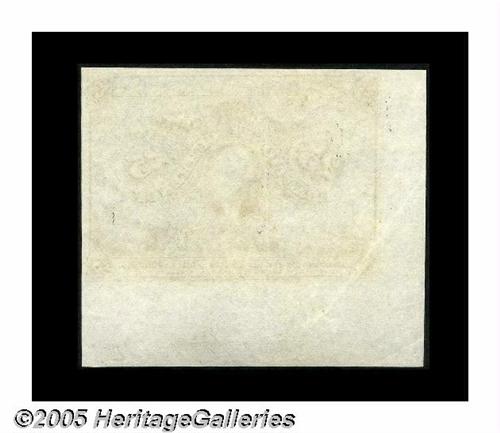 <B>Milton 2E25F.3d 25¢ Second Issue Experimental Choice About New.</B></I> This is the lower-left corner from the full sheet of Experimentals that was lot 985 of our MRF Sale. That sheet contained 20 of these notes which had, until the sheet surfaced, been represented by a single known piece. This note is Superb save for a corner fold. It has the full sheet margins on the left and bottom, including the pencil notation, "No. 1, B.N." Tom obtained it from Doug in his 1999 purchase.