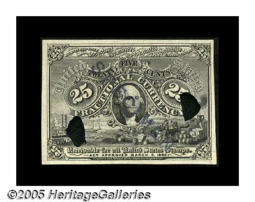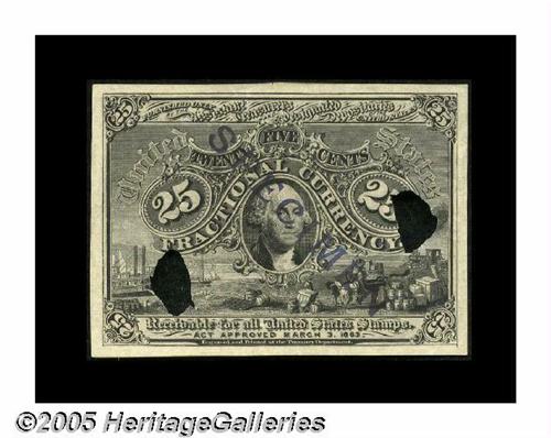 <B>Milton 2E25F.3e and 2E25F.3j 25¢ Second Issue Experimentals Gem New.</B></I> Two gorgeous Experimental notes, the 3e previously lot 986 of our MRF Collection, and the 3j was lot 996. Tom paired these two up in his collection when he discovered that in spite of their being different numbers, they were punch cancelled together. Both the left and right cancels on both notes are oddly shaped, and they mate perfectly. A very interesting pair.
