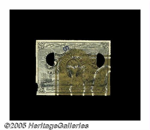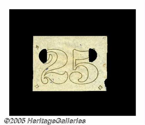 <B>Milton 2E25F.7 25¢ Second Issue Essay (Experimental) New.</B></I> This bears part of a different bond denomination bronze overprint. A perfect Gem save for a missing piece from the left-hand margin. This is the far rarer variety, showing part of the bronzing for the $100 bond. This "100" was printed in digits as opposed to the "FIFTY" used on the $50. This piece shows three-fifths of the "1" and about one-quarter of the first "0." <I>From this cataloger to Milt Friedberg in October of 1983; CAA MRF sale 1/97 lot 1024 to Tom O'Mara.</B></I>