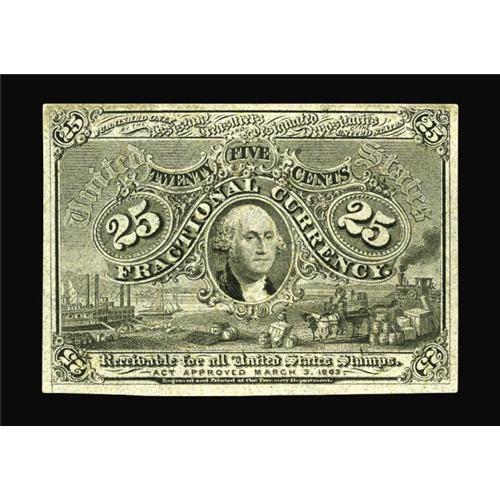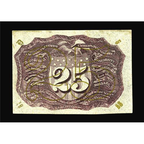 <B>Milton 2E25FR.2 Second Issue 25¢ Experimental Very Choice New.</B></I> This rare Negative Reverse Experimental is not punched or stamped, and it has the full face engraving. The back is a beautiful purple color, negative matrix reverse, with the "D-5-18-63" surcharge referred to in the Chapman sale of the Wilcox Collection in 1904. The so-called "Negative Essay," "Reverse Matrix," or "Negative Matrix" reverse is in reality none of these three things. Early catalogs erroneously called these "Matrix Reverses," mistakenly believing that they were printed from matrix dyes (transfer rolls) rather than plates. Some also felt, as the Chapmans did, that the notes were printed from plates that had been made from other plates rather than from matrix dyes or transfer rolls. The term "Negative Reverses," or "Negative Essays," came from the appearance of the notes, which look at a glance like a photo negative, that is, the dark areas appear light and the light areas appear dark. However, this is not consistent throughout the entire design, as the denomination, parts of the shield and the lettered ribbons are not reversed. This back design was simply an unadopted proposal where someone decided that certain design elements would look better reversed. Debate still continues today as to whether these Negative Essays or the adopted positive designs are the more handsome. The term "Negative Essay," while it would not be technically correct in the realm of professional photography, has been universally accepted by Fractional collectors, dealers and researchers, and it will be used throughout this catalog to describe this category of note. This piece has the entire, completed face printing, lacking only the bronze. The back is the full purple Negative Essay printing, including the large bronze "25" and the "D-5-18-63" corner surcharges which are found only on these negatives. It's a spectacul