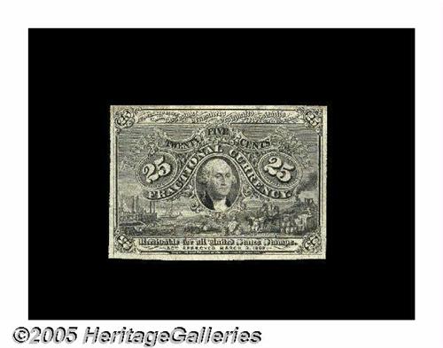 <B>Milton 2E25FR.2 Second Issue 25¢ Experimental Very Choice New.</B></I> This rare Negative Reverse Experimental is not punched or stamped, and it has the full face engraving. The back is a beautiful purple color, negative matrix reverse, with the "D-5-18-63" surcharge referred to in the Chapman sale of the Wilcox Collection in 1904. The so-called "Negative Essay," "Reverse Matrix," or "Negative Matrix" reverse is in reality none of these three things. Early catalogs erroneously called these "Matrix Reverses," mistakenly believing that they were printed from matrix dyes (transfer rolls) rather than plates. Some also felt, as the Chapmans did, that the notes were printed from plates that had been made from <I>other</B></I> plates rather than from matrix dyes or transfer rolls. The term "Negative Reverses," or "Negative Essays," came from the appearance of the notes, which looks at a glance like a photo negative, that is, the dark areas appear light and the light areas appear dark. However, this is not consistent throughout the entire design, as the denomination, parts of the shield and the lettered ribbons are not reversed. This back design was simply an unadopted proposal where someone decided that certain design elements would look better reversed. Debate still continues today as to whether these Negative Essays or the adopted positive designs are the more handsome. The term "Negative Essay," while it would not be technically correct in the realm of professional photography, has been universally accepted by Fractional collectors, dealers and researchers, and it will be used throughout this catalog to describe this category of note. This piece has the entire, completed face printing, lacking only the bronze. The back is the full purple Negative Essay printing, including the large bronze "25" and the "D-5-18-63" corner surcharges which are found only on these negatives. It's a spectacular piece, missing from the 1890's until it appeared in Superior's Fraser Collection Sale in 1982. Purchased then by this cataloger and sold to Doug Hales, it was acquired by Tom O'Mara when he purchased Doug's collection. It's one of only three known examples of this note. If the note had a bronze oval on the face, it would be complete and ready for circulation. As it is, we believe it to be Legal Tender. This piece and its 5¢, 10¢ and 50¢ counterparts could easily have been assigned a Friedberg number had they been brought to the attention of the authors at the proper moment. Milt's identical piece realized $4,400 in 1997, and we expect this extremely important item to easily surpass that this evening.