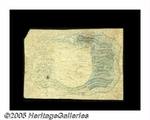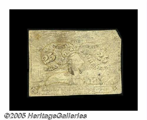<B>Milton 2E25FR.7 25¢ Second Issue Color Trial Good.</B></I> Acquired by Doug Hales as lot 1032 of our MRF Sale, and transitioned to the Tom O'Mara Sale when Tom bought Doug's collection in October of 1999. Our Friedberg description: "Grading only approximately Good, this fascinating and unique piece has either seen considerable actual circulation or is much the worse for improper storage. The face is the 25¢ engraving with an inverted large bronze "25" and the rare "D-5-18-63" surcharge. The back is a light green printing of the reverse engraving with a blank central shield area. This note, which is missing its upper-right corner and has a small body hole, is likely to afford some collector the opportunity of acquiring a unique Experimental note without breaking the bank."