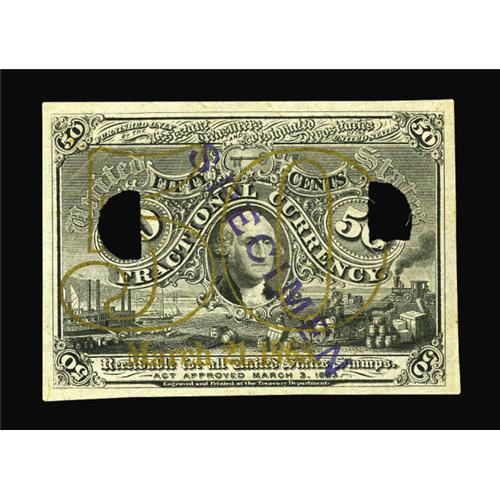 <B>Milton 2E50F.1b 50¢ Second Issue Experimental Gem New.</B></I> From our O'Mara sale, where it was described, "We've led off the 50¢ Experimentals with the same note that led them off in our Friedberg Collection Sale, where it was lot 1040. This piece is arguably the fifth member of the beautiful four-piece set that appears as lot 16375. It's printed from the full, finished face plate, with the large bronze "50" overprinted on the face of the note along with the bronze date, "March 21, 1863." It's identical to the pieces in the set of four but for its blank back. It appears to have been item #6 on Ed Frossard's October 1893 listing of the Spencer Clark Collection. The note is in magnificent as-issued condition, with broad, even margins, bright paper, ink and bronze."