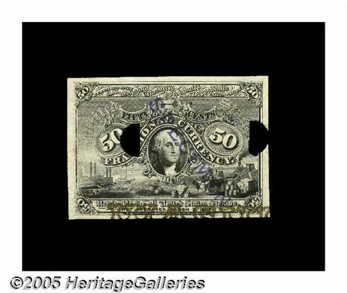 <B>Milton 2E50F.2a 50¢ Second Issue Essay (Experimental) Very Choice New.</B></I> This punched and stamped 50¢ Baltimore-Washington note has the tops of the letters "WASHI" across its bottom margin. It's a beautifully well-centered note, with all its original embossing, and it is as fine a condition example of this category of Experimental as will ever likely be found. It comes quite near the full Gem grade.