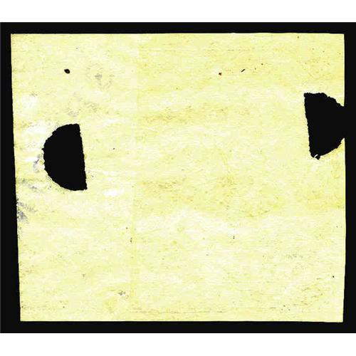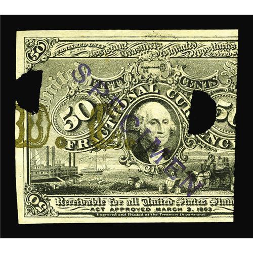 <B>Milton 2E50F.2d 50¢ Second Issue Essay (Experimental) Choice New.</B></I> This piece is about four-fifths of a note (very common from this era, particularly for these extra-bronzed pieces). The note is punched and stamped, and it has the bronze "D.C." These pieces with the additional bronze overprint came when paper that was intended for use on Experimental National Bank Notes was used for Fractional after the unrelated bronzing was applied. The "D.C." on this note was part of "WASHINGTON D.C." A far more detailed explanation appears in both our January 1997 and May 2005 catalogs.
