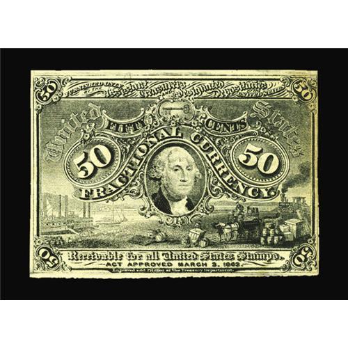 <B>Milton 2E50F.4i 50¢ Second Issue Experimental Choice New.</B></I> Previously lot 1055 from our January 1997 sale where it realized $660. It was described there, "From the very rare class of Experimentals that is not stamped 'SPECIMEN' or punch cancelled. It's printed from the completed Second Issue 50¢ face plate on a fine, soft, yellowed bond paper. Although this note does not have a watermark, Milt Friedberg conjectured that it was on the same paper that contains the 'OLIER' watermark in several places on the sheet. This is a Rarity-8 note, with only two or three examples known to exist."