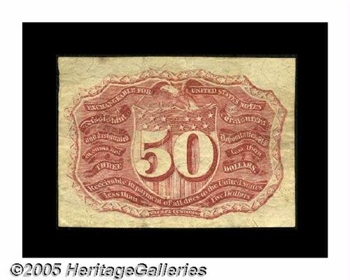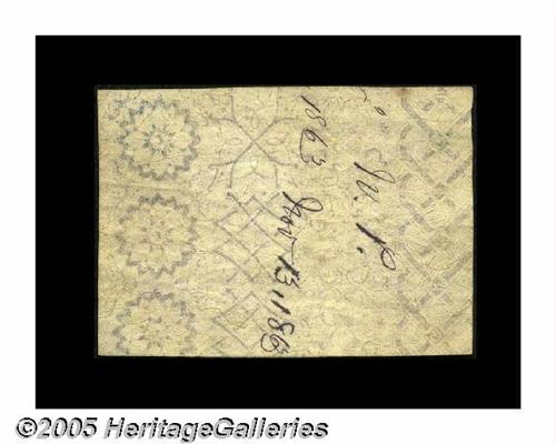 <B>Milton 2E50FR.8 50¢ Second Issue Experimental Lavender "Wallpaper" About New.</B></I> This important and highly intriguing piece was previously lot 1067 of our Friedberg Collection Sale. It was described there, "Apparently lot 971 from the S.H.&H. Chapman February 15, 1904 sale of the Wilcox Collection. The piece was described there, '50¢ reverse as regular issue but without gilt 50, etc. reverse shows an elaborate series of designs in lavender - thick fiber paper.' This About New piece matches that description exactly, the only exception being that the Chapman sale makes no mention of contemporary writing on the 'wallpaper' side, 'W.P. 1863 Nov 13, 1863.' This lavender design was seen on a larger sheet of paper by Milt Friedberg at one point. He believes it to be a border design that surrounds an engraving of the Treasury Department building. If this is the Chapman example, the note is likely unique; if it's a different example, then two are now known. As an uncancelled, unstamped 50¢ back Experimental, it would be of major importance even without its intriguing 'face.'" <I>Denly's of Boston to Milt on April 1, 1985; MRF CAA 1/97 Lot 1067.</B></I>