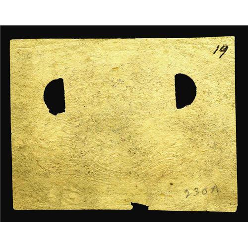 <B>Milton 2E50R.1 50¢ Second Issue Negative Essay New.</B></I> Printed on an odd, thin fibrous paper quite unlike the normal fiber papers, stiff or soft papers on which most of these unusual experimentals come. This was originally item #19 from Frossard's 1893 listing, and that number is written in brown pen at the top right of the blank back. This note is plated on page 74 of the Fractional Encyclopedia. It is a Choice New example but for some very minor handling and a small nick at the bottom edge, far away from the design. Milt refers to this paper as "yellowed" in his encyclopedia description, but we are not at all convinced. The paper has a rather craft-like quality, and although the point is moot, we believe this to be its original color.