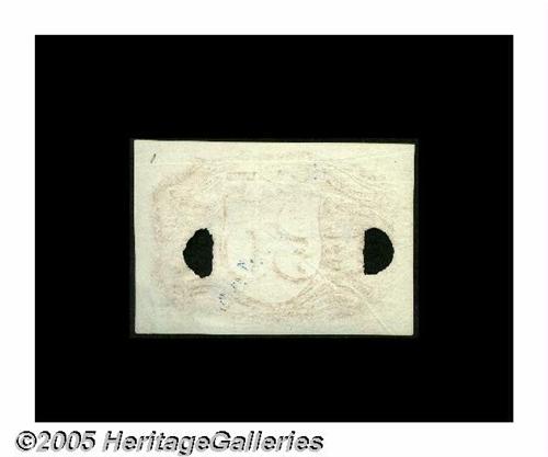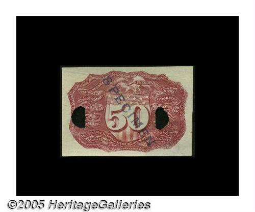 <B>Milton 2E50R.1d 50¢ Second Issue Negative Essay Gem New.</B></I> A superb example of the Negative Essay back. But for a few minor pre-print wrinkles in the soft white paper, this piece is flawless. It is an incredibly sharp printing in deep red on perfect white paper. The soft quality of that paper has allowed the embossing effect to show boldly through on the unprinted side. It's an uncommonly wonderful combination of beauty, extreme rarity and ideal preservation. <I>Superior's Fraser sale lot 98 2/1982; FCI to MRF 8/1984; MRF CAA 1/97 lot 1072 to Tom O'Mara.</B></I>