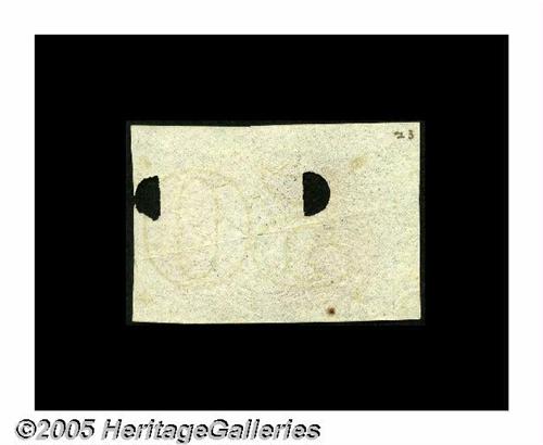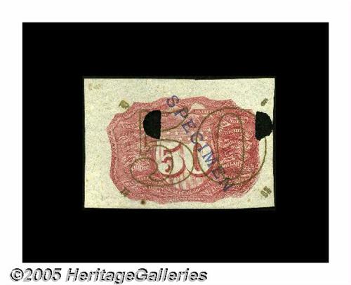<B>Milton 2E50R.2a 50¢ Second Issue Negative Essay Choice About New.</B></I> This Wide Margin Negative Essay Experimental printing has the bronze "D-5-18-63" coner surcharges as well as the large "50" surcharge. It was originally item #23 on Ed Frossard's special list #8 issued October 1, 1893. On that list, Frossard had mistaken the Old English "D" for a "B." He did that in every instance where this surcharge appears. Frossard's penned "23" appears lightly in the upper right corner of the blank back. It was described on that list, "50¢ Carmine Back, with large skeleton 50 in gold; B-5-18-63 in corners. White fibrous paper," and priced at $2.00. This beautiful Negative Essay is a Gem but for a pre-print fold visible only on the blank back, and a rust spot at the bottom just outside of the design area. The original embossed effect is very apparent on this thin, white fiber paper. This is one of the few instances where the "D-5-18-63" surcharge appears on a uniface Wide Margin note. <I>Ed Frossard list #8; Lester Merkin to MRF; CAA MRF 1/97 lot 1073 to Tom O'Mara.</B></I>