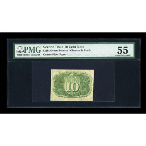 <B>Milton 2E10R.6 10c Second Issue Experimental</B></I> <B>PMG About Uncirculated 55.</B></I> This important note is the finalized back plate printing on heavy fiber paper, with no bronze, no cancellations and no specimen stamp. An insignificant sheet fold on the left edge accounts for the AU grade.<BR><BR><b>Shipping:</b> Coins & Currency (<a target="_blank" href="http://www.heritageauctions.com/common/shipping.php">view shipping information</a>)