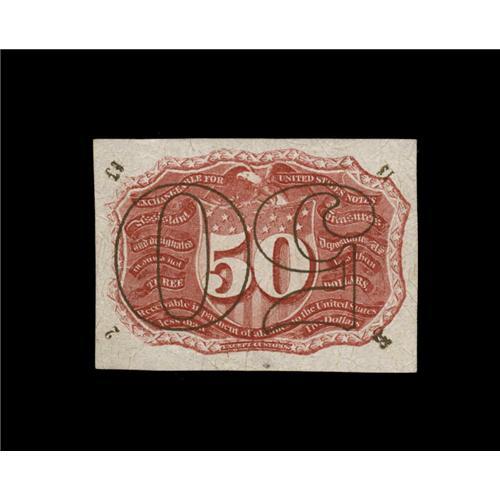 <B>Milton 2E50R.4b 50¢ Second Issue Experimental Invert Superb Gem New.</B></I> A different note but identical to our Friedberg example piece which realized $880 as lot 1080 in January of 1997. This is a letter-perfect example of an extremely rare experimental invert. A number of pieces are known of this type punched and stamped, but only three examples are known uncancelled and one is damaged. Doug Hales acquired this piece from NASCA and it moved on to Tom O'Mara six years ago when he purchased Doug's collection.
