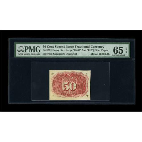 <B>Milton 2E50R.4b 50¢ Second Issue Experimental Invert PMG Gem Uncirculated 65 EPQ.</B></I> Previously Lot 1080 from our January 1997 sale of the Milt Friedberg Collection. Several hole-canceled examples of this note are known, but only three uncanceled pieces. One of the uncanceled examples is damaged; the other two are this piece and the O'Mara piece. All uncanceled Second Issue Experimentals are quite scarce, and this one, with the inverted bronze, is striking-looking and popular as well as rare.<BR><BR><b>Shipping:</b> Coins & Currency (<a target="_blank" href="http://www.heritageauctions.com/common/shipping.php">view shipping information</a>)