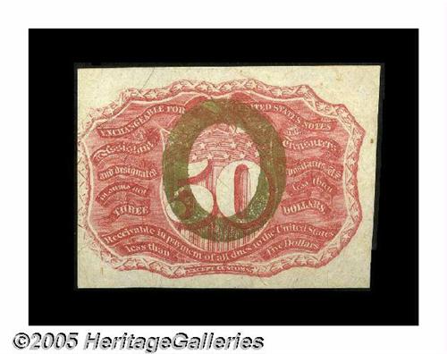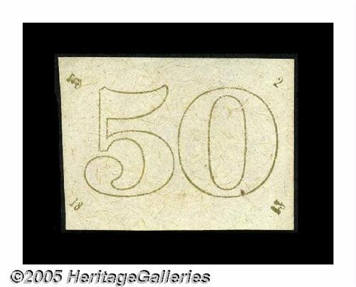 <B>Milton 2E50R.4e 50¢ Second Issue Experimental Very Choice New.</B></I> This and the Friedberg Note are the only two examples we know of. This piece is slightly the superior of the two. The other example realized $880 as lot 1085 of our January 1997 Sale. The note has terrific eye appeal and a charismatic attraction due to its "Which side is up?" enigma. The note has the full bronzing both face and back of the regular issue Fr. 1321, but the back engraving is printed on the same side of the note as the bronze oval, and the large bronze "50" and "R-2-18-63" surcharge appear on the other side. A few examples are known punched and stamped, but free of those cancellations, this fiber paper experimental is an extreme rarity. This cataloger sold the note to Doug Hales in the early eighties, Tom O'Mara acquired it with the purchase of the Hales Collection in 1999.