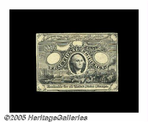 <B>Milton 2E5F.2? Second Issue Plate Progress Proof Choice About New.</B></I> This piece is extremely similar to several of the items in the 2E5F.2 group, but it does not precisely match any of them, as the paper lacks fibers and is thick, yellowish and hard. It's an unpunched, uncancelled, undenominated piece with the portrait of Washington printed rather than pasted in place. But for the denomination, the key, the enabling act date and the frame around the portrait, this note is complete. These non-denominated Second Issue Experimentals form an extremely interesting series as they travel from the pasted-on portrait of the previous two lots, to the engraved portrait lacking its proper frame line such as this note, then on to the denominated piece as in the next lot, and finally the completed note two lots down. This great piece is flawless but for a corner fold, some very light soil and a minor wrinkle.