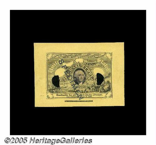 <B>Milton 2E5F.2a Second Issue Progress Proof Gem New.</B></I> Printed on bright yellow paper and identical to the unique item #52 from Ed Frossard's 1893 listing except that this piece has the George Washington vignette, although that vignette is mounted to, rather than a printed part of, this piece. This is one of the earliest progress proofs of the Second Issue, bearing the earlier act date of July 17, 1862 and lacking many elements of the finished plate. This is also part of a very short series of proofs that had the words "Engraved and Printed at the Treasury Department." printed outside the boundary of the note in a separate block rather than in its final position below the enabling date. A spectacular piece that Tom acquired when he purchased Doug Hales' incredible collection. The original embossing appears pressed through the heavy yellow paper. The ideal companion piece to the white-paper note in the next lot. In fact, these apparently resided together at some point in the past, as each has a light pencil notation in the upper-right corner of its blank back: a "19" on this yellow-paper note and a "20" on the white-paper piece. Difficult to estimate, but it's one of the most important Second Issue items in the O'Mara Collection. We would expect a realization in the area of . . .