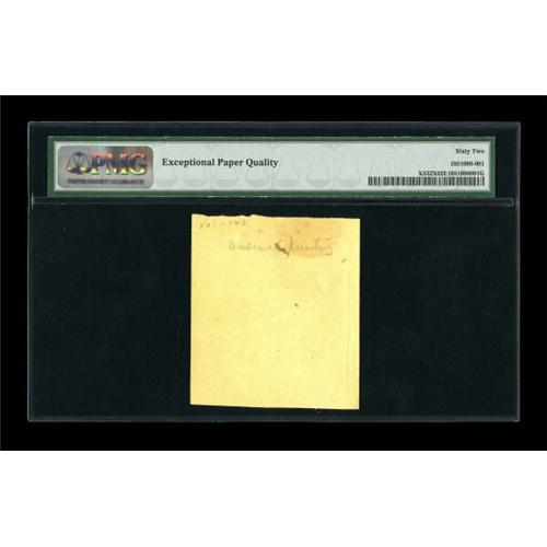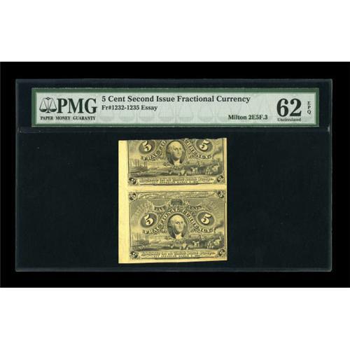 <B>Milton 2E5F.3 5¢ Second Issue Essay Vertical Pair PMG Uncirculated 62 EPQ.</B></I> Apparently Lot 941 from the S.H.&H. Chapman February 15, 1904 sale of the Wilcox Collection. To our best knowledge, only two of these pairs exist: this one, which is missing the top portion of the top note, and an identical pair, with a full top note that is missing the bottom half of the bottom note. Printed on hard, thin yellow paper with the finalized face design, lacking only the bronze oval. The back is blank. The Five Cent denomination is the rarest of the Second Issue Experimentals.<BR><BR><b>Shipping:</b> Coins & Currency (<a target="_blank" href="http://www.heritageauctions.com/common/shipping.php">view shipping information</a>)