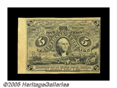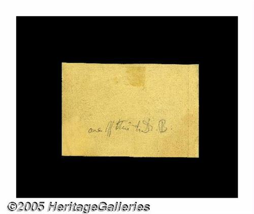 <B>Milton 2E5F.3a 5¢ Second Issue Essay Choice New.</B></I> Printed on thick yellow paper (light cardboard) from the finished 5¢ face plate. The quality of the engraving is exceptional. This note was apparently printed using a brand-new plate under particularly heavy pressure, as the print quality is remarkable and the embossing clearly penetrates through to the back of the heavy paper. Only two examples are known, this one, which Tom O'Mara acquired from the Doug Hales Collection, and the other, lot 892 from our January 1997 Sale.